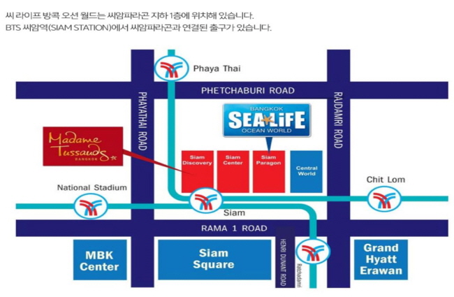 시암 파라곤 백화점 -> 시암 센터 지나서 도보 약 3분 거리에 위치해 있습니다.