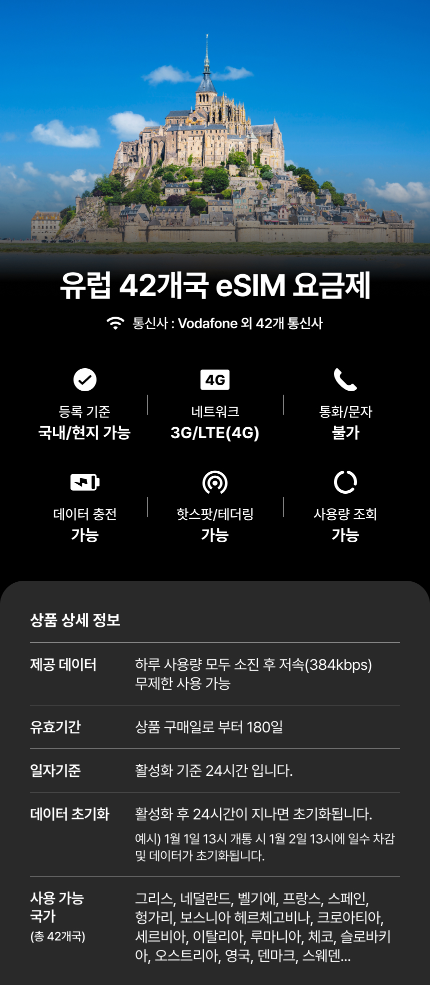 [유럽 42개국] eSIM 데이터 무제한 (1GB)/매일 1GB 이후 속도 저하
