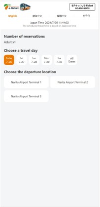 2. 이용일, 승차/하차 지점 선택, 시간 선택 3. 예약확인 4. 버스티켓 예약 성공 5. 현장에서 QR코드 제시 ※버스 예약화면은 한국어 지원이 가능합니다
