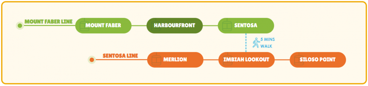 마운트 파버와 센토사 섬 사이의 하늘을 날며 독특한 시각으로 라이온 시티를 여행하실 수 있습니다. 마운트 페이버 라인만 포함된 왕복 여행입니다. 마운트 페이버 라인의 역은 마운트 페이버 역, 하버프론트 역, 센토사 역입니다.