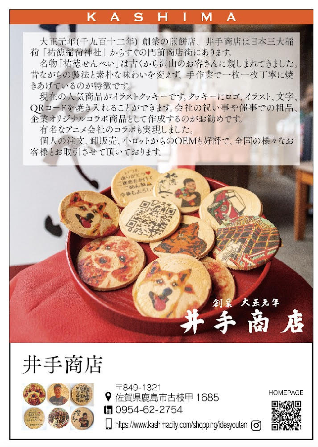 유토쿠이나리 신사에서 도보로 약 3분, 몬젠 상점가에 있는 1912년에 창업한 "이데쇼텐(井手商店)" (유토쿠센베이) 그림 그리기를 좋아하는 4대 현 점주가 시작한 사진 쿠키 체험을 즐겨보세요! 유토쿠 신사 참배와 세트로 즐겨보세요!! ●유토쿠 이나리 신사란? 사가현 가시마시에 있는 유토쿠이나리신사는 일본 3대 이나리 중 하나로 꼽히며 장사번창, 가운번영, 만선기원, 교통안전 등의 혜택이 있다고 믿어 연간 약 300만명의 참배객이 방문하는 사가현에서도 손꼽히는 관광명소입니다. ●이데상점이란 1912년에 창업한 센베이 가게 "이데쇼텐"은 100년 이상 센베이를 만들어 온 전통있는 가게입니다. 조상 대대로 이어지는 옛 제조법을 바꾸지 않고 하나하나 정성을 들여 직접 정성껏 구워내고 있습니다.