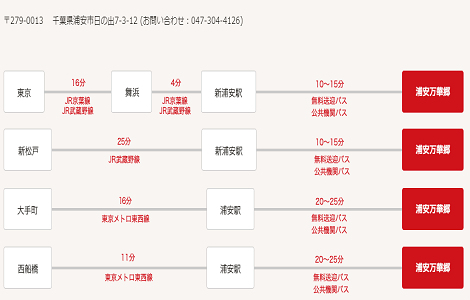千葉県浦安市日の出7-3-12 7 Chome-3-12 Hinode, Urayasu, Chiba 279-0013 일본 지하철을 타고 우라야스 역까지 이동해, 우라야스 역에서 택시를 타고 우라야스 오오에도 온천으로 이동 신우라야스역 정류장에서 신우라야스역 무료 셔틀 버스 탑승 후 "오에도 우라야스 온천역"에서 도보 10분 소요