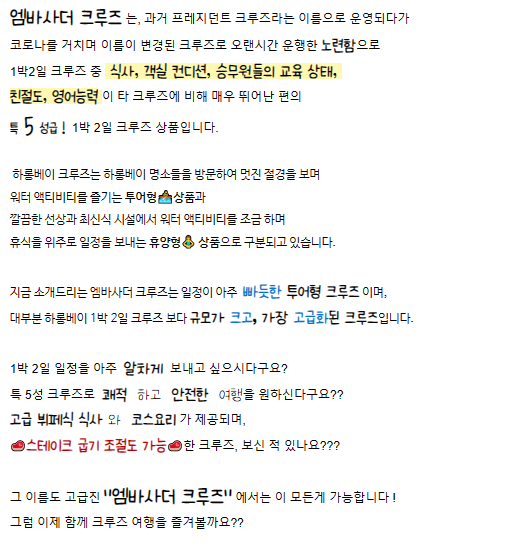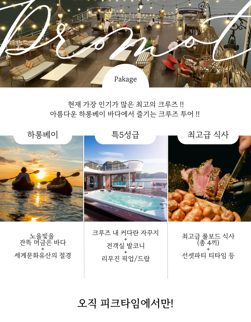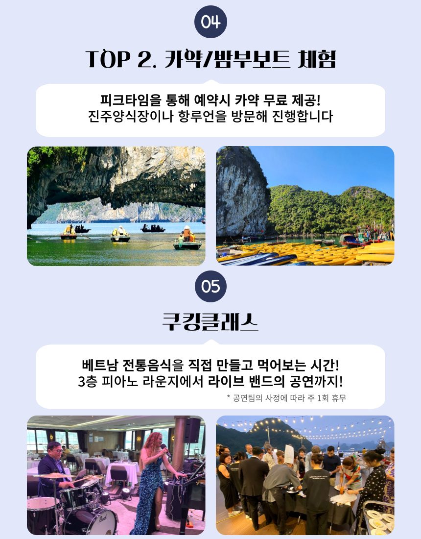 이렇게 상품에 대한 간단한 설명을 드렸구요. 저희 아이러브베트남에서는 정확한 정보 전달을 위해 당연히!!! 짧은 주기로 해당 크루즈를 직접 방문하고 있습니다 ! 주의 ! 저희처럼 상세한 설명이 없다면 직접 다녀오지 않고 판매하는 경우가 많으니 주의하세요 그럼 여행 일정을 세세히 살펴보도록 하겠습니다~ 레츠 고우!!!👉👉 * 지금부터 이하 내용들은, 당일 크루즈 현장 상황에 따라 예고 없이 변경될 수 있습니다.