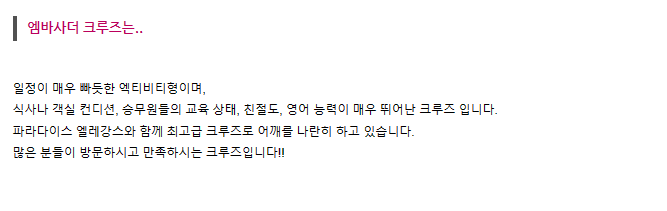 • 식사나 객실컨디션, 승무원들의 교육상태, 친절도, 영어능력등이 매우 뛰어난 크루즈
