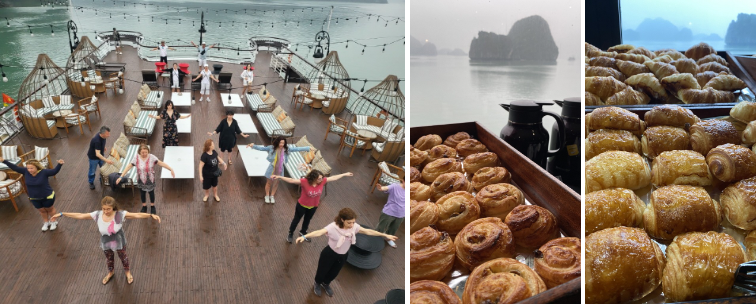 2일차 AM 06:30, 4층 썬데크에서 베트남식 태극권 타이치 기공체조로 아침 운동을 하고, 3층 피아노 라운지에서 준비되어 있는 커피와 페스츄리 빵이 제공됩니다