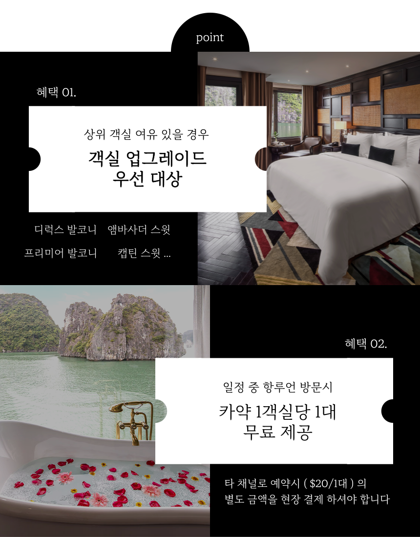 악기상 또는 선박의 문제 등으로, 선상 숙박을 대신하여 하롱베이의 호텔 숙박이 제공된 경우에는 환불되지 않습니다.