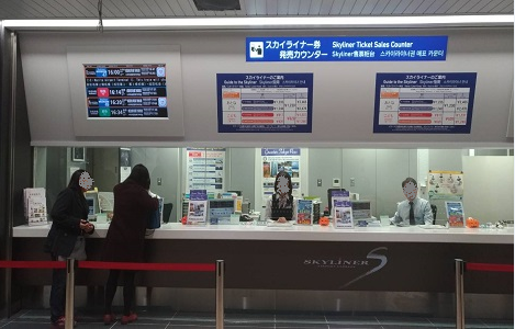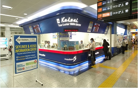 KEISEI 스카이라이너 카운터. 운영시간 07:00-21:00 SKYLINER KEISEI INFORMATION CENTER. 운영시간 07:00-21:00 KEISEI 티켓카운터-나리타공항 제1터미널 1층 북쪽 출구. 운영시간 07:00-21:00 KEISEI 티켓카운터-나리타공항 제1터미널 1층 남쪽 출구. 운영시간 07:00-21:00