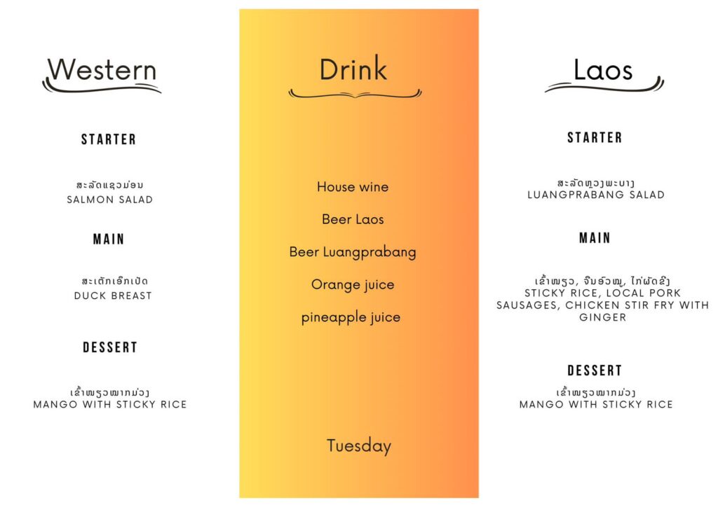 럭셔리 선셋 디너 크루즈 :파인 다이닝 인 크루즈: (RIVER SUN LAOS) 루앙프라방에서 멋진 선셋 크루즈를 경험할 준비가 되셨나요? 메콩강에서 새로운 럭셔리 선셋 크루즈를 경험하세요! 메콩강을 따라 펼쳐지는 새로운 럭셔리 크루즈에서 탁 트인 일몰을 감상하며 멋진 저녁 식사를 즐겨보세요! *디너 메뉴는 매일 변경 됩니다* [크루즈 운영시간] 16:30-19:00 (시즌에 따라 변동가능) *정확한 출발 시간은 별도 안내 드립니다. *출발시간 20분 전 까지 체크인 장소에 도착 하셔야 합니다. [메뉴 안내] 음식은 양식과 라오스식 중 선택 가능합니다. 아래 메뉴는 샘플이며 매일 변경됩니다. (일반적으로 양식 선택을 많이 하십니다)