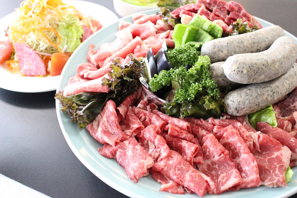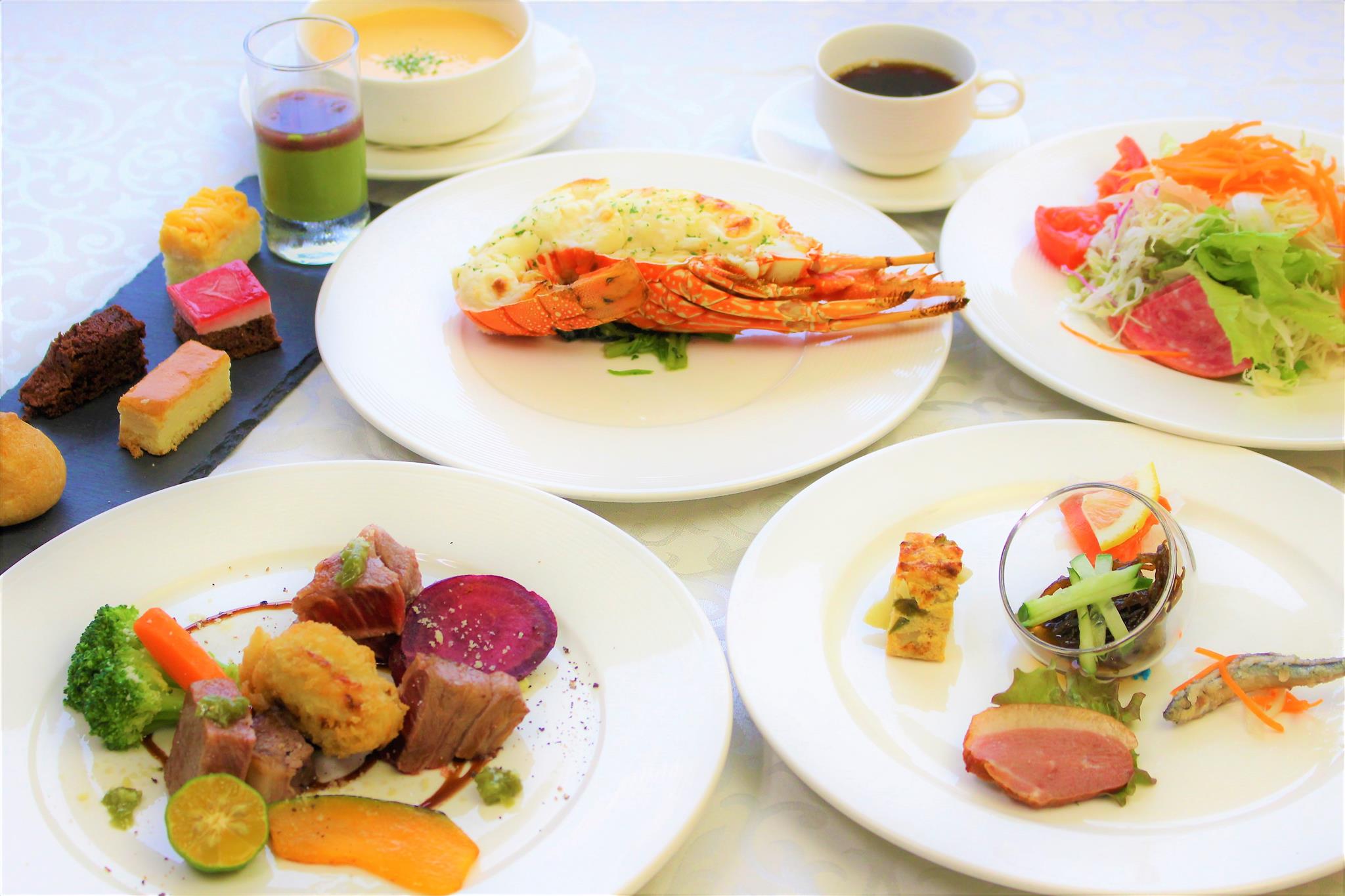 [코스별 메뉴] 1. 코랄 코스(2F) - 전채요리, 흰살 생선&누룽지 스위트 칠리, 닭고기 및 제철야채 바포르 쟈포네제, 수제 빵 또는 라이스 2. 에메랄드 코스(2F) - 전채요리, 흰살 생선 포와레, 저온에서 찐 오키나와 돼지고기&독일 생소세지, 수제 빵 또는 라이스 3. 사파이어 코스(2F) - 생선회, 생선구이, 조림, 계란찜, 튀김, 쇠고기 스테이크, 콩요리, 채소 절임, 라이스, 국 (계절에 따라 일부 변경 가능) 4. 루비 코스(2F) - 전채요리, 쿠메지마산 참새우와 참돔의 아쿠아 파짜, 쇠고기 등심 스테이크, 수제 빵 또는 라이스 5. 다이아몬드 코스(2F) - 전채요리, 랍스터 테르미도르, 모토부 쇠고기 탈리아타 자연식 와사비 간장절임, 수제빵 또는 라이스 6. 주니어 코스(2F) - 오늘의 수프, 셀렉트 샐러드, 수제 햄버거, 수제빵 또는 라이스, 소프트 드링크 7. 어린이 코스(2F) - 오늘의 수프, 어린이 플레이트 (닭고기 폴펫티니, 오무라이스, 파스타, 샐러드, 디저트), 소프트 드링크 8. 스탠다드 BBQ(3F) - 육류(쇠고기 등심, 오키나와산 파인애플 포크, 치킨 다리, 소갈비), 프랭크 소세지, 샐러드(큰 접시), 구운 야채, 라이스, 디저트 9. 디럭스 BBQ(3F) - 육류(쇠고기 등심, 류큐 토종돼지 아구, 두껍게 썬 차돌박이, 소갈비), 프랭크 소세지, 샐러드(큰 접시), 구운 야채, 라이스, 디저트