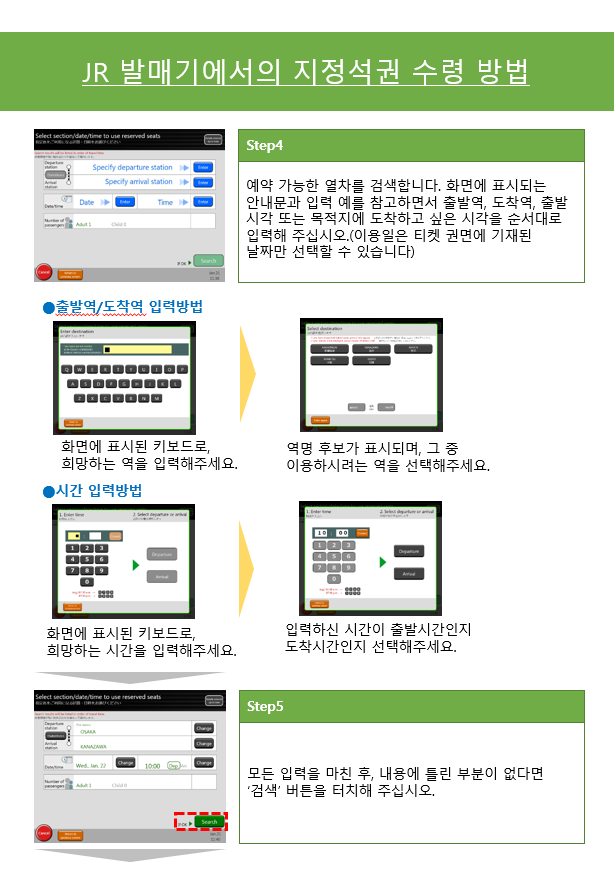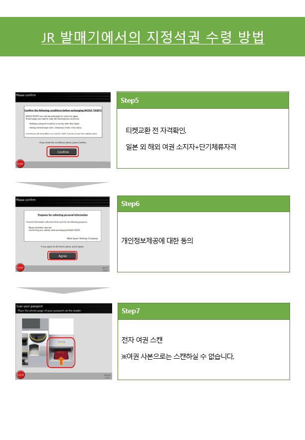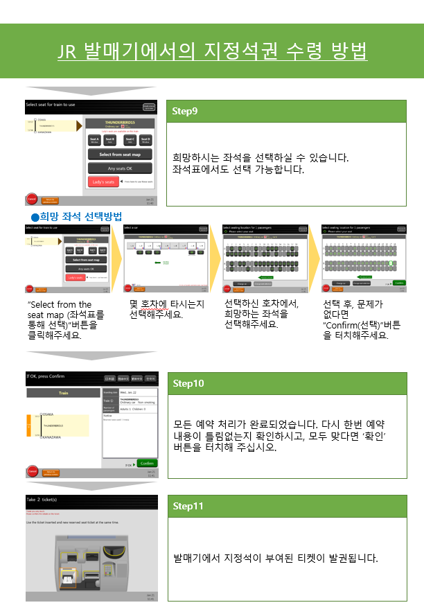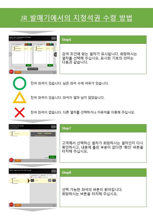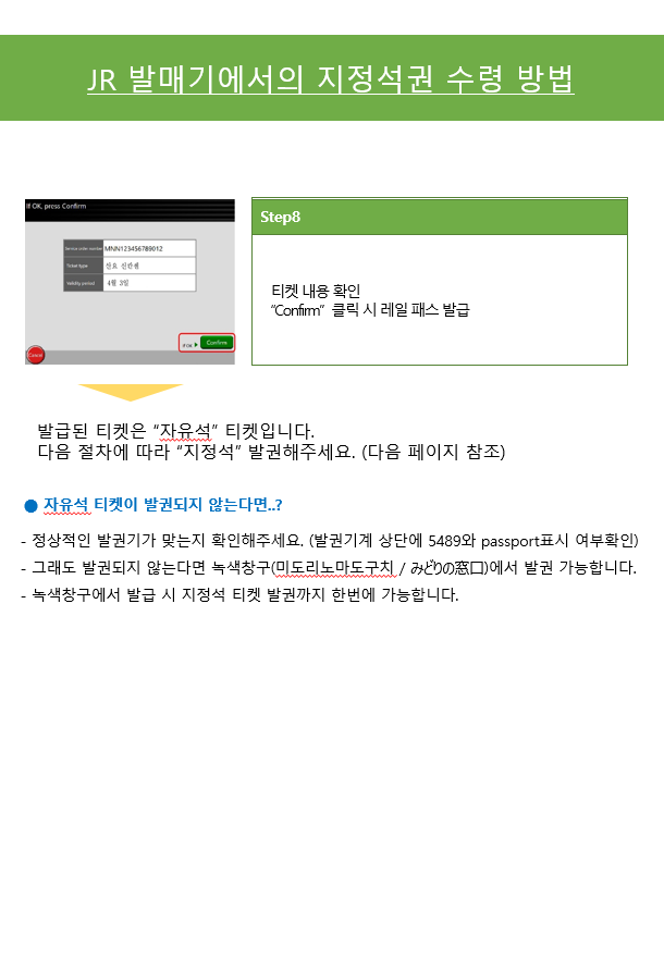 15. 티켓 발권기에 결함이 있거나 또는 여권에 IC칩이 부착되지 않은 경우, 지정된 역의 미도리노마도구치(みどりの窓口)에서 실물티켓으로 교환해 주세요. 16. 도야마까지 가시는 손님은 반드시 쓰루가역에서 호쿠리쿠 신칸센으로 환승해주세요. 환승 시에는 후쿠리쿠 신칸센의 “도야마 타입(쓰루기)”만 승차 가능합니다. 17. 구매하신 구간에서만 승하차가 가능하며, 구간 내의 다른 역에서 도중하차하실 수 없습니다. 18. 티켓을 분실(도난 포함)하시면 재발급되지 않습니다.