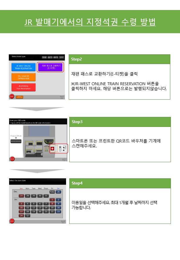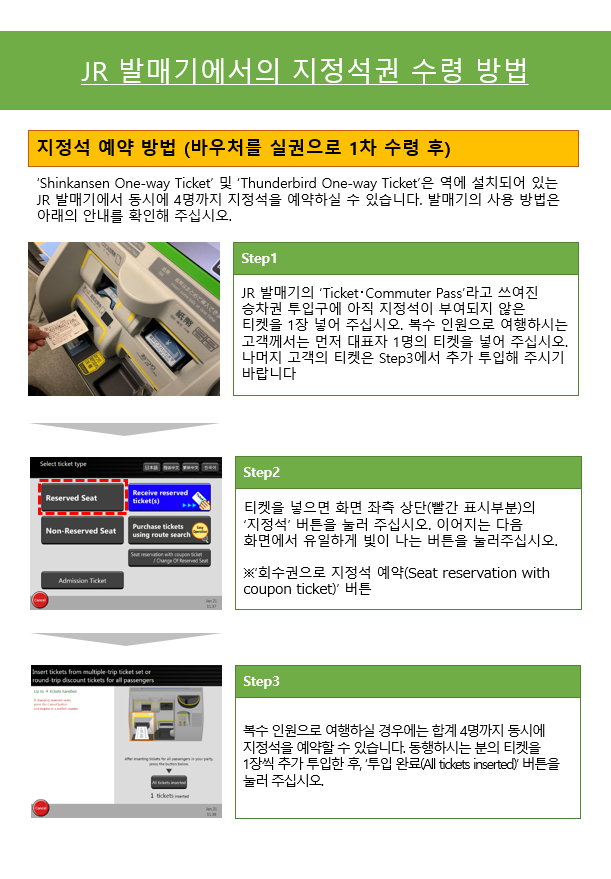 예약시 10장이내로 구매해 주세요. 그 이상 구매시는 경우 바우처가 발행되지 않습니다. 1. 이 상품은 자동 예약 상품입니다. 당일 예약 당일 이용 가능합니다. 2. 바우처의 유효기간은 JTR구매일로부터 90일간 유효합니다. (이용지정일이 아닌 구매일) 3. 바우처를 실권으로 교환한 후에는 티켓 교환 시 지정한 날짜에만 유효합니다. 4. 예약 시 반드시 손님의 여권상의 이름을 기재해 주세요. 5. 2장 이상 예약하시는 경우, 대표자의 정보를 중복 기입하는 것이 아닌 이용예정자 전원의 정보를 기입해주세요. 그렇지 않은 경우, 티켓은 발행되지 않습니다. 6. 예약 시 성별 구분이 필요합니다. (MR, MS, CH) 중 하나를 꼭 기재해주세요. *CH : 아동 6. “오사카 시내→후쿠이” 등 이용방향을 맞게 예약해주시길 바랍니다. “오사카 시내→후쿠이” 티켓으로 “후쿠이→오사카 시내” 방향으로 이용하실 수 없습니다. 7. 유효기간 내 미사용 바우처에 한해 무료 취소 가능합니다. 8. 바우처를 실권으로의 교환 후에는 여행사에서 환불이 불가능합니다. 이용일2일전까지는 자유석의 경우 440엔, 지정석의 경우 560엔의 환불수수료가 부과됩니다. 이용일 1일전~열차시각까지는 승차권220엔+티켓가격의 30%가 환불수수료로 부과됩니다. * 간사이공항(関西空港)역에서도 환불 가능합니다. 9. 일본 이외의 정부의 여권소지자만 이용 가능합니다. 단, 영주권 소지자, 장기체류(유학, 취업비자 등)자는 이용하실 수 없습니다. 10. 티켓 발권 시 여권을 꼭 지참해주세요. 여권 사본으로는 불가능합니다. 11. 바우처를 지정석 티켓으로 교환하기 위해서는 총2회의 교환 과정이 필요합니다. 1) 바우처를 발권기를 통해 1차 발권하시면 “썬더버드 방일관광티켓(자유석)”을 수령할 수 있습니다. 2) 수령하신 자유석 티켓을 다시 한번 발권기 또는 마도구치에서 교환하시면 지정석 티켓을 받을 수 있습니다. 해당 과정을 통해 발생한 티켓 2종류를 모두 소지하셔야 합니다. 단, 도야마까지의 티켓은 열차 환승이 필요하므로 총3장의 티켓이 발권됩니다. 12. 만약 원하시는 시간대의 열차가 만석인 경우, 자유석 티켓으로 이용하거나 다음 열차를 이용해주세요. 자유석 티켓으로 열차 이용 시 자유석과 지정석의 차액은 환불되지 않습니다. 13. 사용 가능한 티켓 발권기는 “5689”과 “passport” 표시가 있고, 여권 판독기가 있는 경우에만 발권 가능합니다. 14. 티켓 발권 진행 시, 파란색의 “JR-WEST ONLINE TRAIN RESERVATION” 버튼이 아닌 보라색의 “재팬 패스로 교환하기(E-티켓)” 버튼을 클릭해주세요