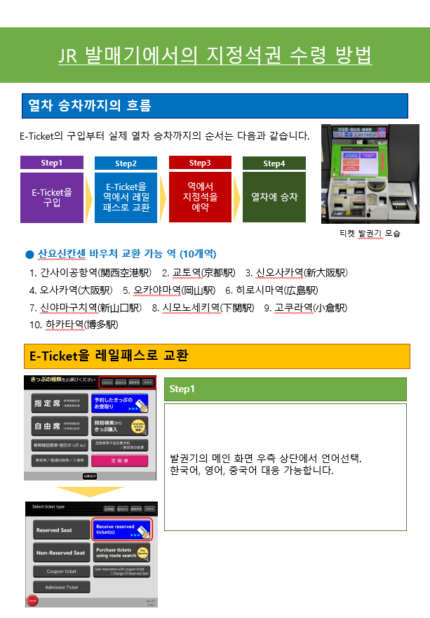 바우처를 지정된 역의 티켓 발권기 또는 미도리노마도구치(みどりの窓口)에서 발급하여 주세요. 발권기는 4개국어(일본어, 한국어, 영어, 중국어) 대응 가능합니다. 발권 시 여권 확인 절차가 있으므로 여권을 꼭 지참해 주세요. 발권된 티켓은 자동 개찰기에 넣어 사용 가능합니다. (역무원에게 티켓 제시가 아닙니다.) 실권으로 교환 후에는 교환 시 이용지정한 날짜에만 이용 가능합니다. 도야마까지 가시는 손님은 쓰루가역에서 호쿠리쿠 신칸센으로 환승해주세요. (후쿠이, 가나자와는 환승x) [교환 가능 역(7개)] 1. 간사이공항역(関西空港駅) 2. 교토역(京都駅) 3. 신오사카역(新大阪駅) 4. 오사카역(大阪駅) 5. 도야마역(富山駅) 6. 가나자와역(金沢駅) 7. 후쿠이역(福井駅)