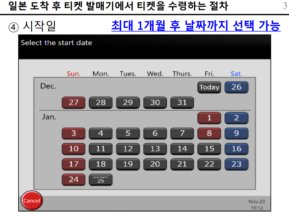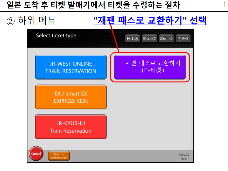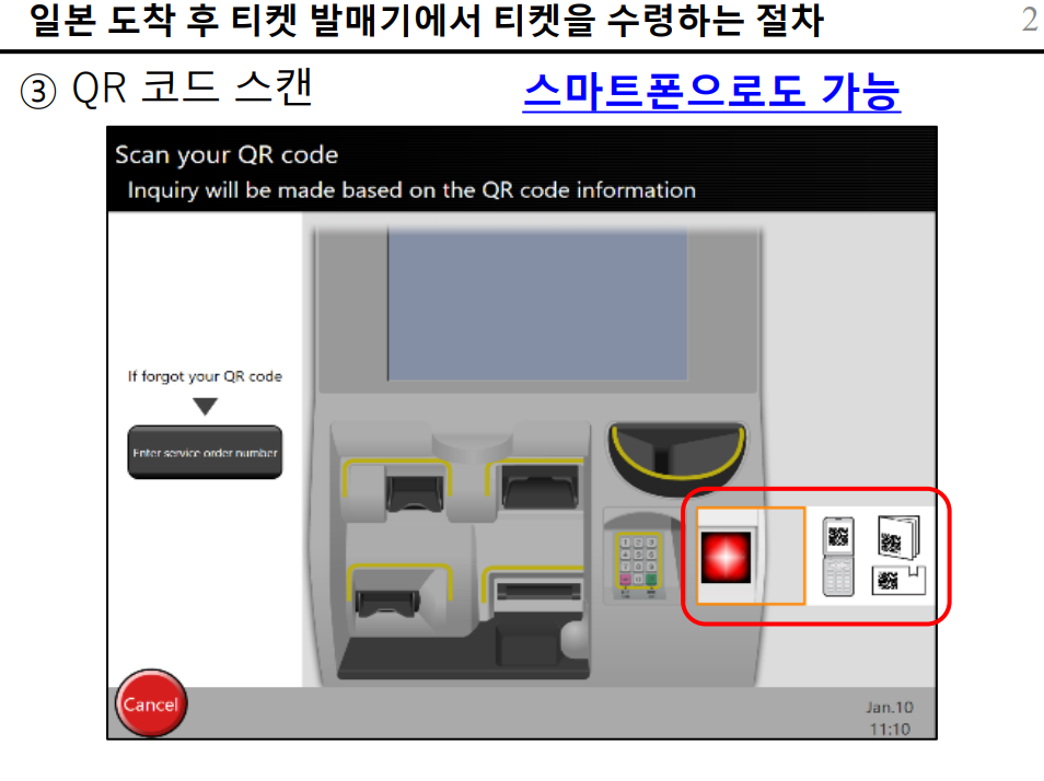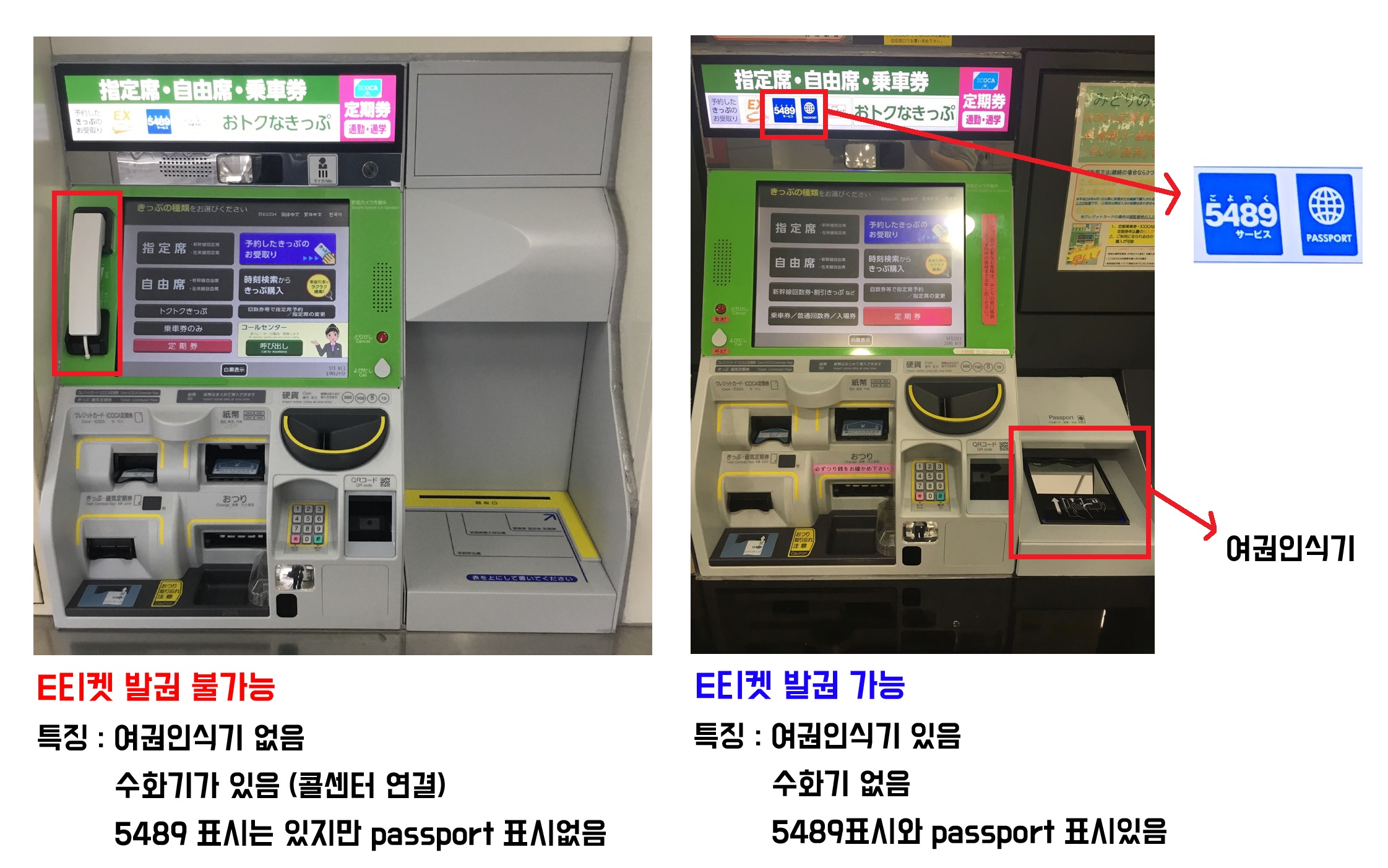 11. 티켓 발권기에 결함이 있거나 또는 여권에 IC칩이 부착되지 않은 경우, 지정된 역의 미도리노마도구치(みどりの窓口)에서 실물티켓을 교환해 주세요.