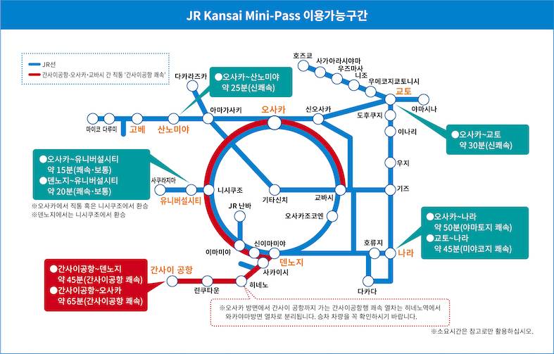JR 간사이 미니 패스는 한국, 중국인 관광객 한정 레일패스입니다. 간사이 지역의 핵심코스인 오사카, 교토, 나라, 고베 지역까지의 JR 신쾌속, 쾌속, 보통 열차를 연속 3일간 무제한으로 이용할 수 있습니다