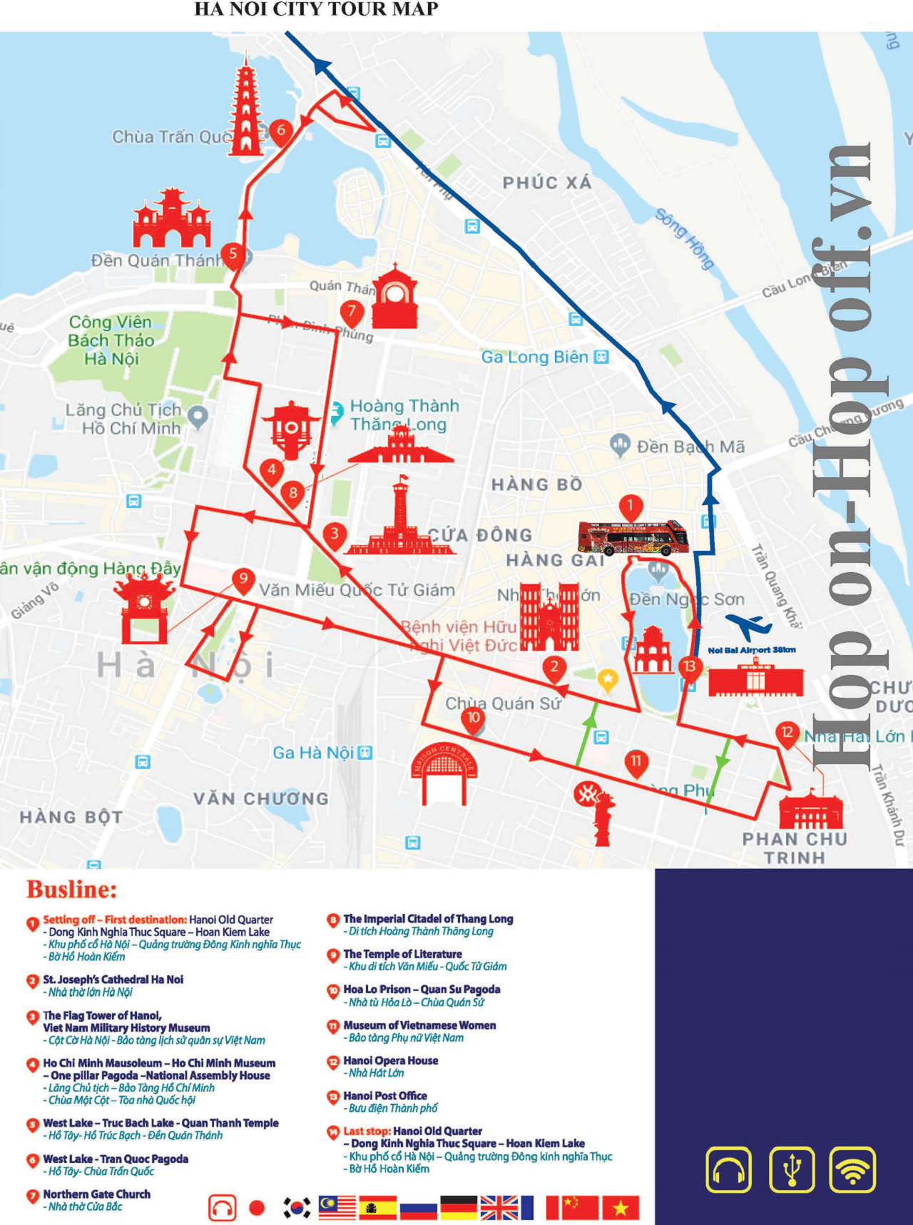 정류장 1 - 프로그 플라워 가든 정류장 2 - 하노이 우체국 (금요일 오후, 토요일, 일요일에는 이용 불가) 정류장 3 - 하노이 성당 정류장 4 - 군사 역사 박물관 정류장 5 - 탕롱황성 정류장 6 - 꽌탄 도교 사원 정류장 7 - 쩐꾸옥 사원 정류장 8 - 호치민 묘소 정류장 9 - 하노이 문묘 정류장 10 - 호아로 수용소 정류장 11 - 하노이 성당 정류장 12 - 베트남 여성 박물관 정류장 13 - 하노이 오페라 하우스