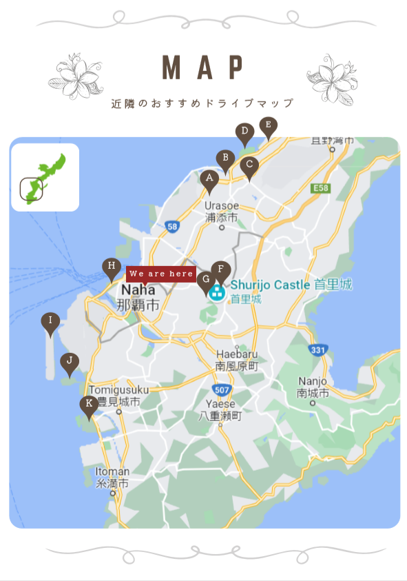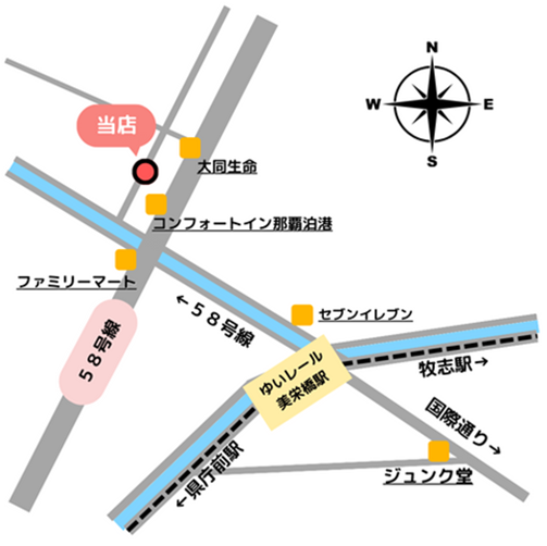 沖縄県那覇市前島3-1-8 Happiness yui 1F https://maps.app.goo.gl/eaB2omRzSYvwCsjj6 모노레일 미에바시역(美栄橋駅)에서 도보7분