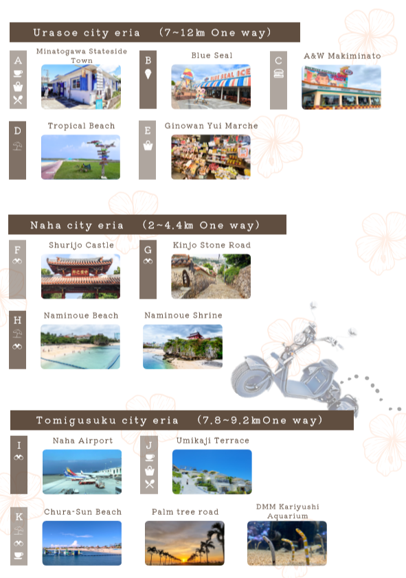 전기자전거를 타고 오키나와의 도시와 자연을 체험해 보세요! 무더운 날씨에도 오키나와의 바람을 느끼며 관광을 즐기실 수 있습니다. 오키나와는 차가 많이 막히지만 전기자전거가 있다면 막힐 걱정없이 다닐 수 있습니다. 전기차로 주유할 필요없이 1회 충전으로 30km까지 주행 가능합니다😊