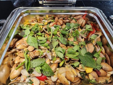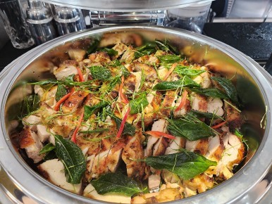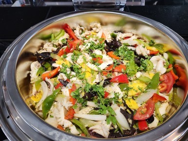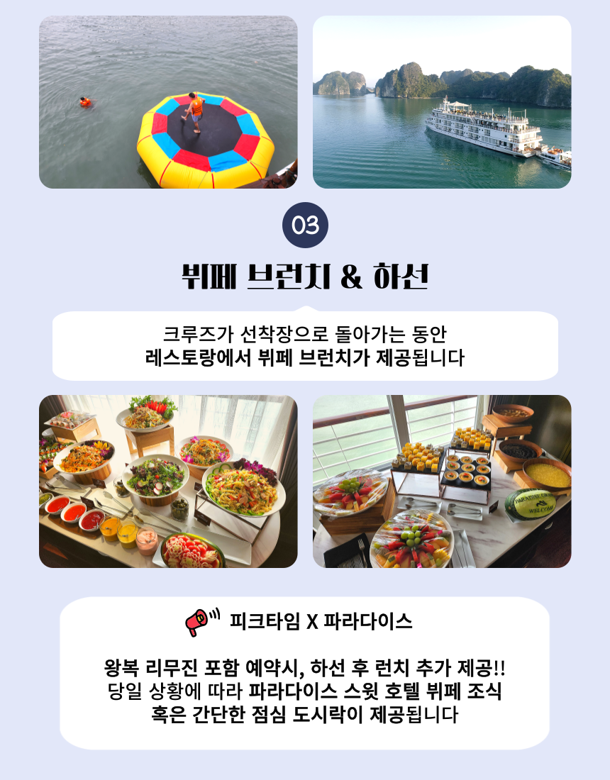 식사 메뉴는 당일 현장 상황에 따라 예고없이 변동될수 있습니다 객실 배정 후, 3층 레스토랑에서 중식 뷔페 식사가 제공 됩니다. 식사에 많은 노력을 가하는 크루즈로 만족스러운 점심 식사로 여행을 기분좋게 시작합니다. 초밥과 다양한 베트남 음식, 찜 구이류등으로 다양하게 제공됩니다