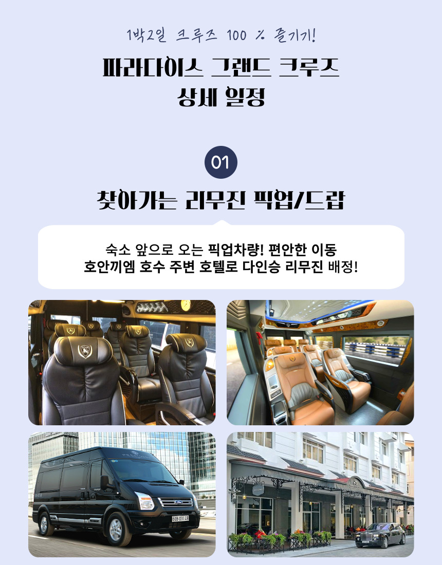 이렇게 상품에 대한 간단한 설명을 드렸구요. 저희 아이러브베트남에서는 정확한 정보 전달을 위해 당연히!!! 짧은 주기로 해당 크루즈를 직접 방문하고 있습니다 ! 주의 ! 저희처럼 상세한 설명이 없다면 직접 다녀오지 않고 판매하는 경우가 많으니 주의하세요 그럼 여행 일정을 세세히 살펴보도록 하겠습니다~ 레츠 고우!!!👉👉 * 지금부터 이하 내용들은, 당일 크루즈 현장 상황에 따라 예고 없이 변경될 수 있습니다.