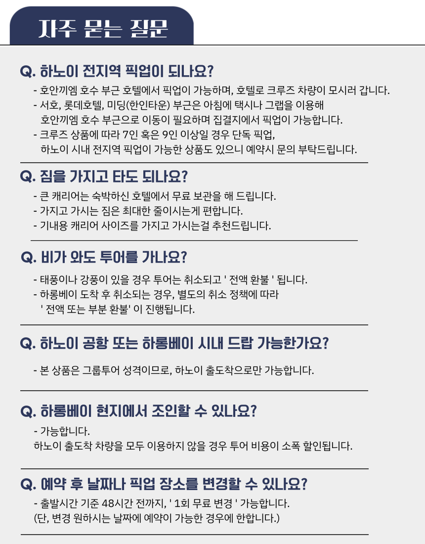 | 하노이 픽업을 포함하여 전체 취소시 | 전액 환불 / 날짜 변경 무료 |