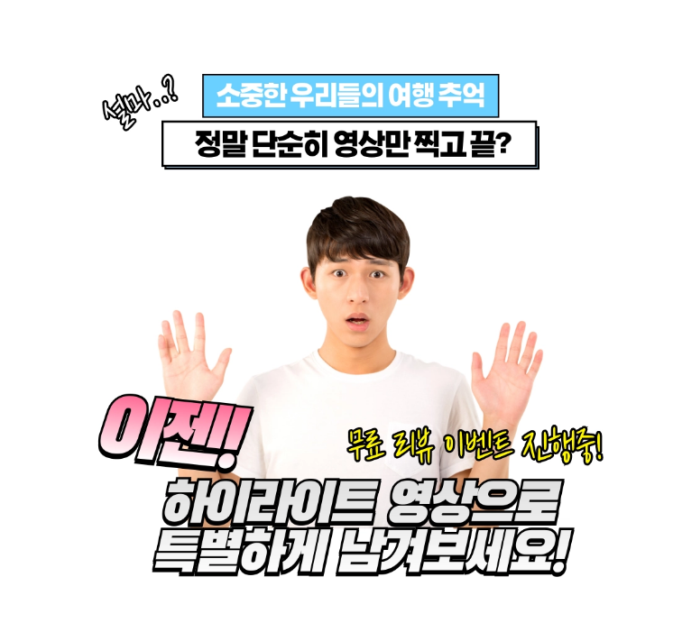 리뷰약속시 BASIC (1분하이라이트영상 or 사진인화20장) 제공을 1분30초영상 or 사진인화 30장으로 혜택을 업그레이드!