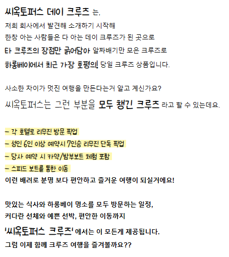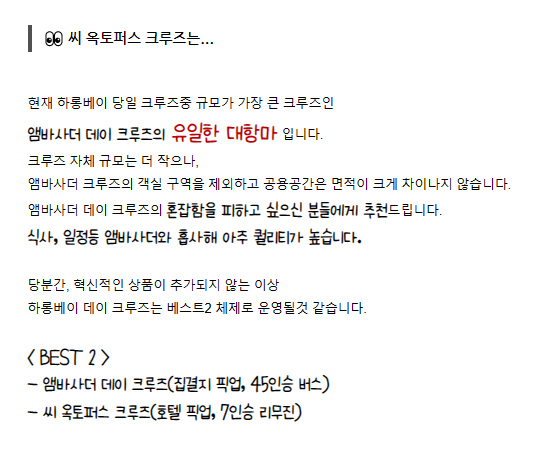 ![[하롱베이] 씨 옥토퍼스 데이 크루즈 당일 하노이 리무진 픽업 포함 #투어 및 휴양형](https://www.boolub.com/upfiles/smarteditor/202403181159431432996614.png)