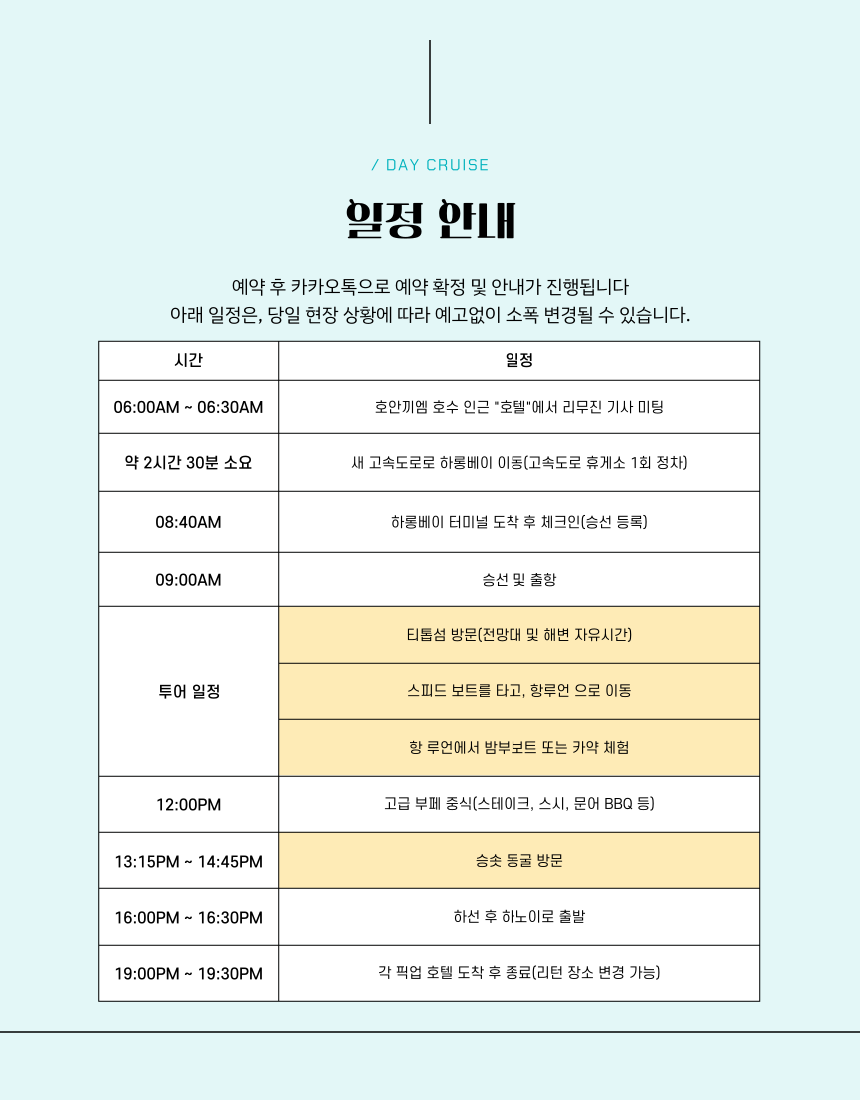 * 현장 상황에 따라, 너무 이른 시간에 도착하셨을 경우엔 항구 건물에서 잠시 대기 후 크루즈로 모셔다 드립니다