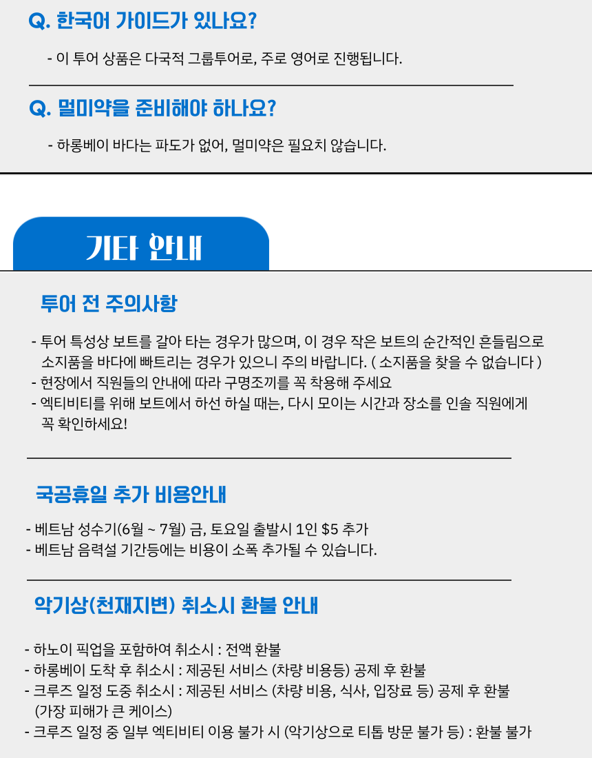 | 하노이 출발, 하롱베이 도착 후 취소시 | 제공된 서비스(차량 등)비용 공제 후 환불 |