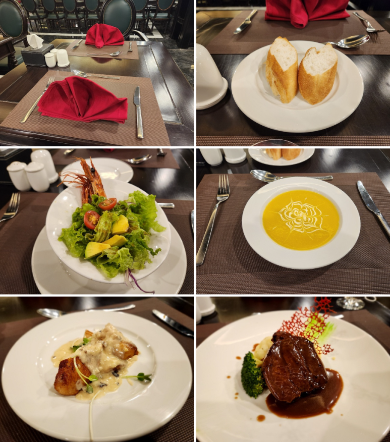 식사 메뉴는 현장 상황에 따라 예고없이 변동될 수 있습니다 오후 7시 경, 대망의 저녁식사가 레스토랑에서 제공됩니다. 크루즈 여행의 가장 중요한 부분을 차지하는 일정이라고 생각합니다. 맛있는 식사가 순서대로 제공됩니다