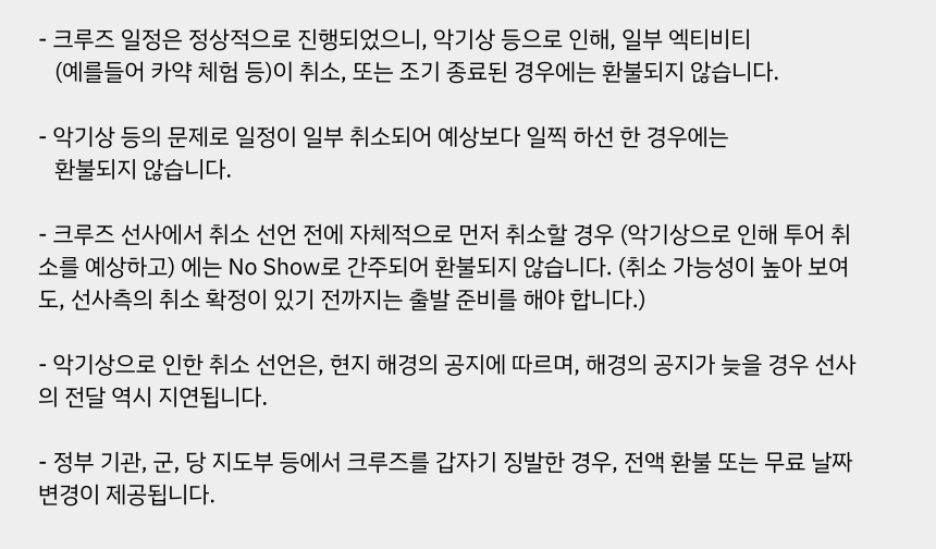 | 크루즈 일정 도중 취소 시 | 제공된 서비스(차량, 중식, 입장료) 공제 후 환불 |