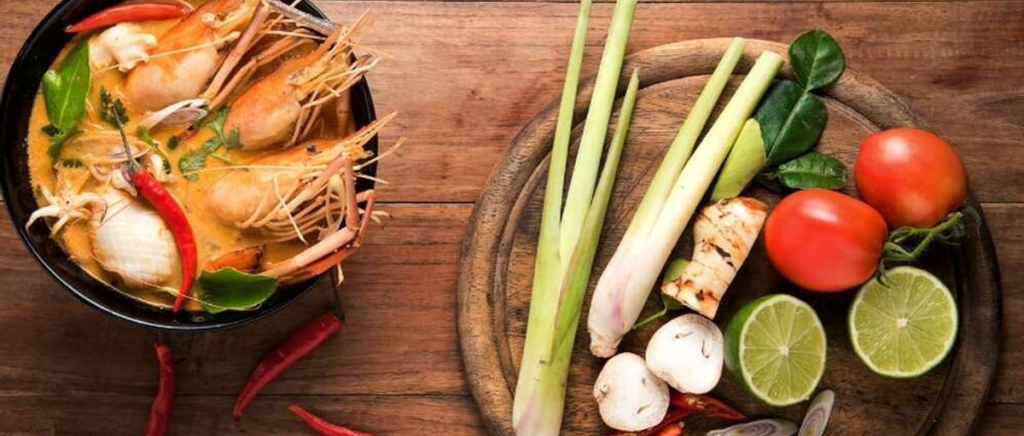 똠얌 꿍 (Thai spicy soup with shrimp), 똠 카 까이 (Thai coconut chicken soup), 똠 쯧 따오후 무쌉 (Clear soup with tofu and mint pork)