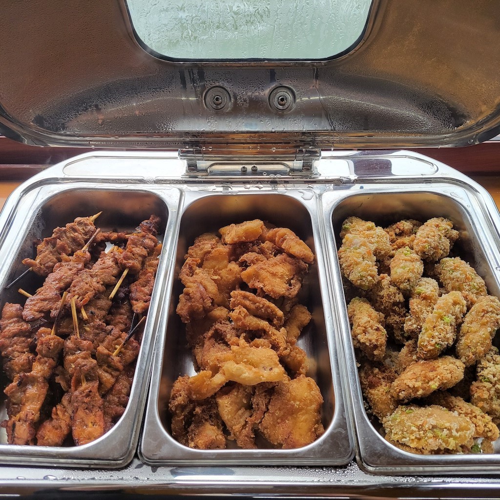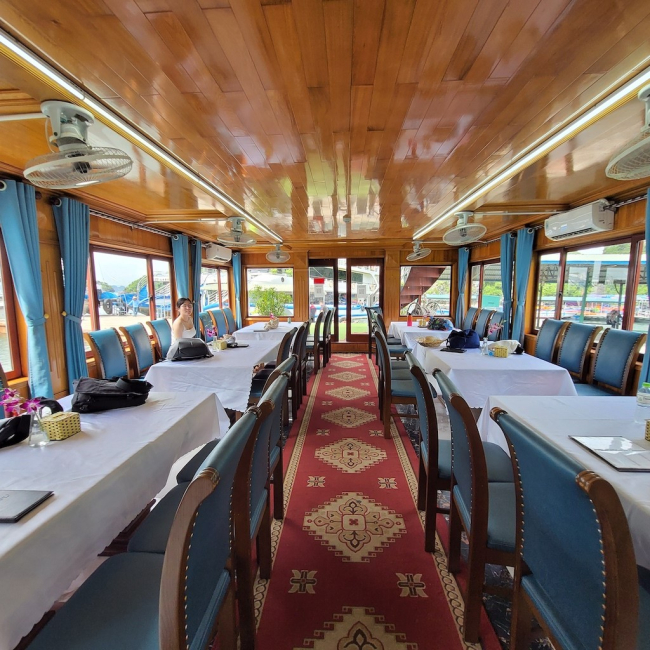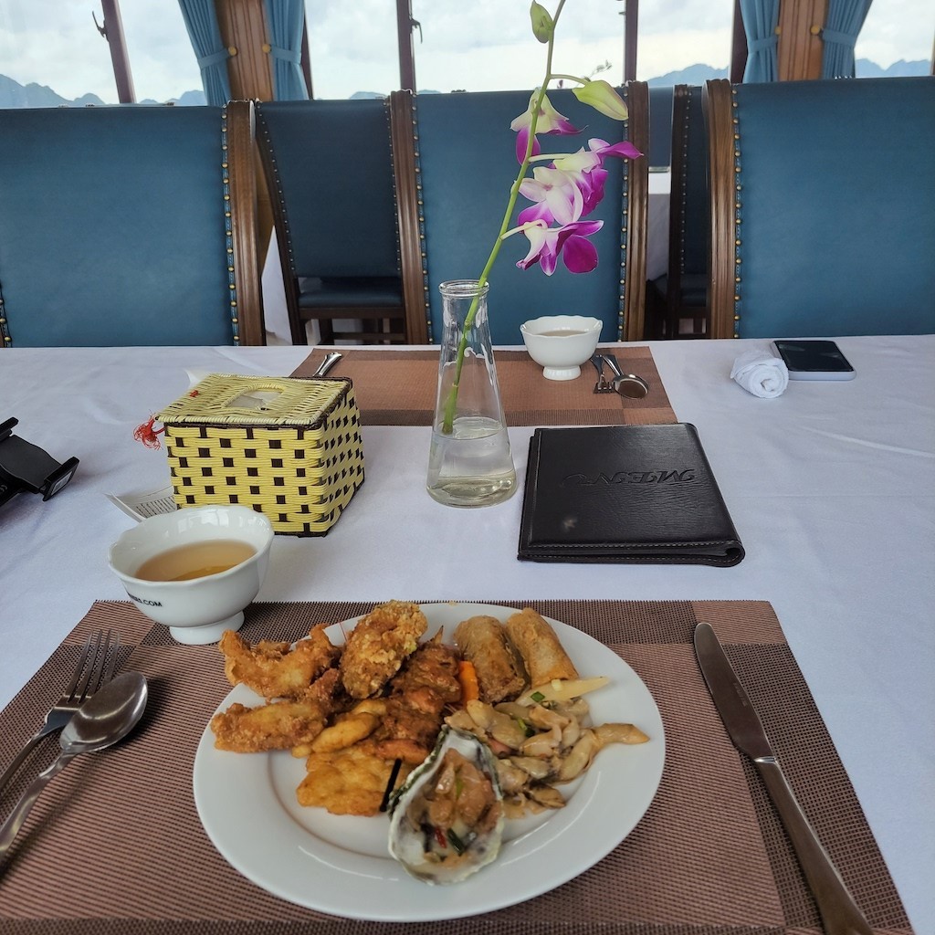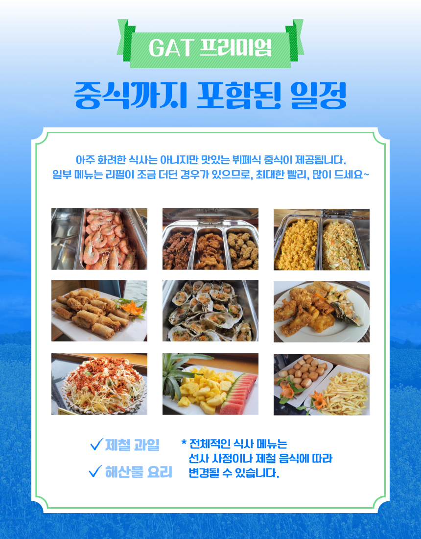 메뉴는 당일/현장 상황에 달라 질 수 있습니다. 보트가 출발하면, 당일 투어 가이드의 일정 소개, 안전사항 안내 후, 점심식사가 제공됩니다. 아주 화려하진 않지만, 맛있게 잘 제공됩니다. 일부 메뉴는 리필이 조금 더딘 경우가 있으므로, 최대한 빨리, 많이 드세요~