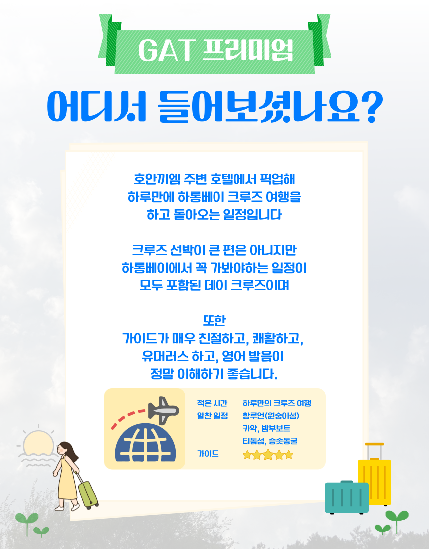 ☞ 친절하고, 쾌활하며, 영어 발음이 뛰어남과 유머러스함까지 챙긴 가이드분과 함께 하고싶으신분들은 GAT 프리미엄 크루즈 추천드립니다!
