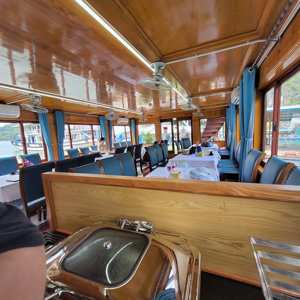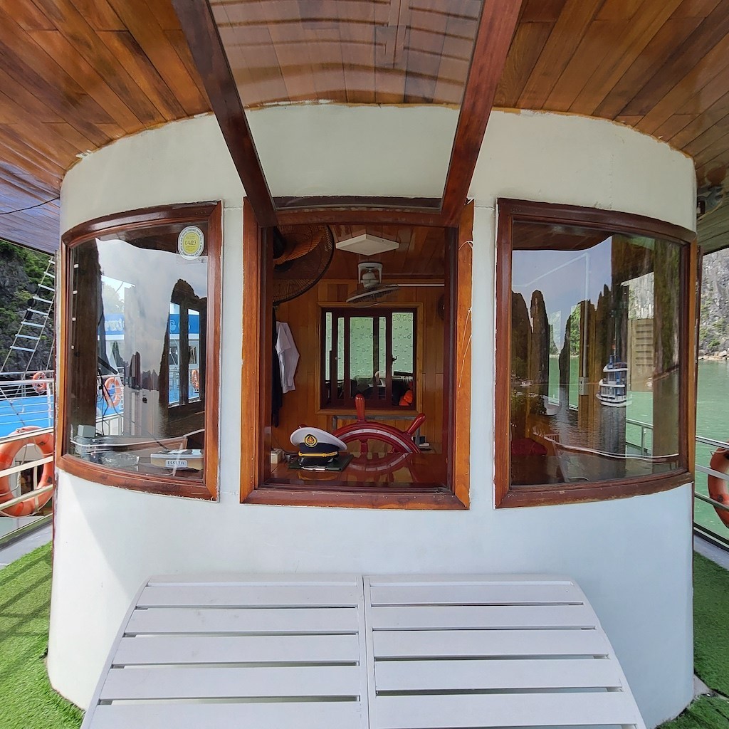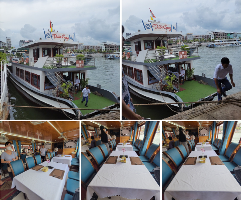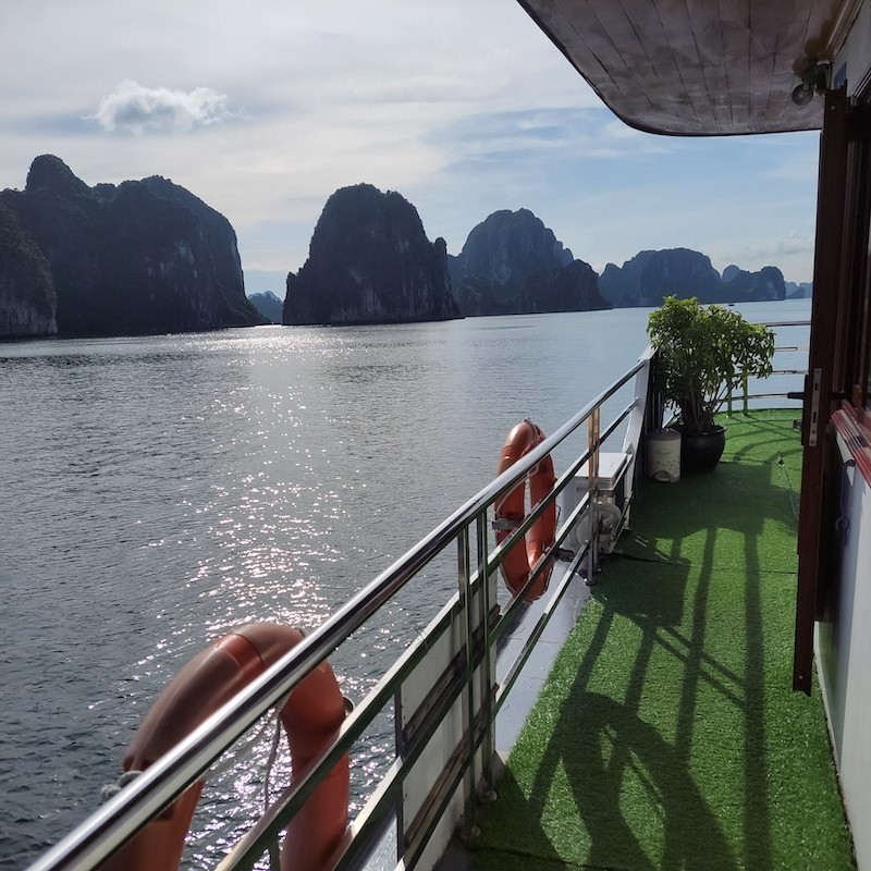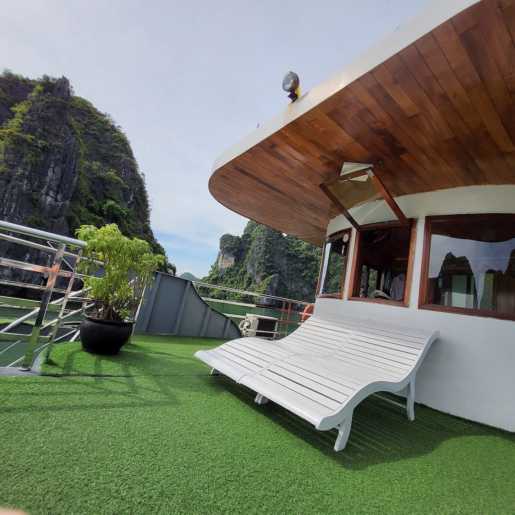 하롱베이 선착장 도착 후, 가이드의 안내에 따라 승선합니다. 보트는 크고 화려하지 않지만, 시설도 깔끔하고 에어컨도 빵빵하게 잘 나옵니다. (아래 사진을 누르면 크게 확대 됩니다) 2층 선데크에는 그늘막과 바닥에 인조잔디가 깔려있어 무척 쾌적합니다