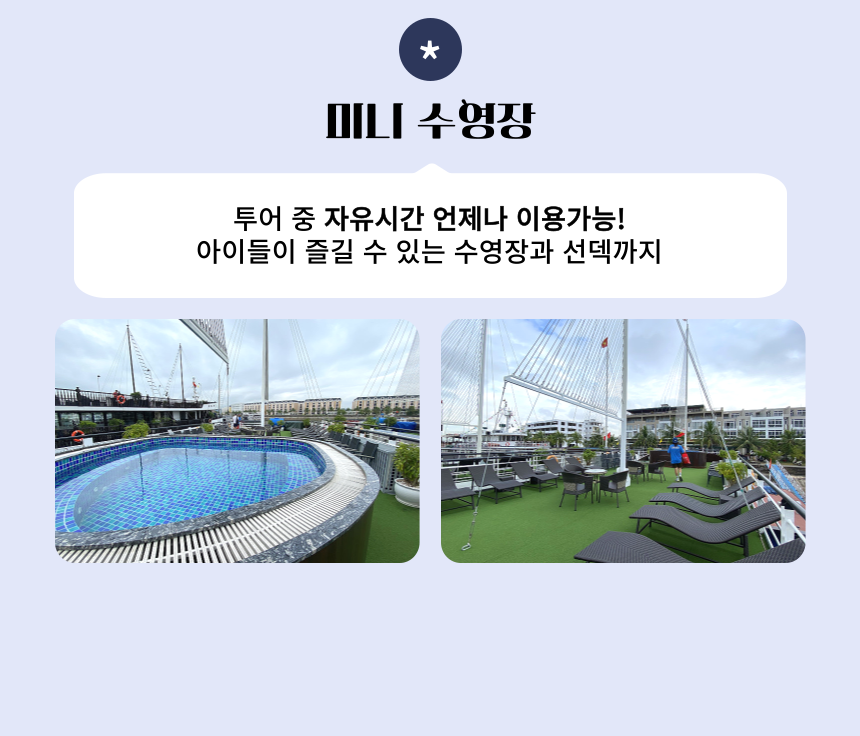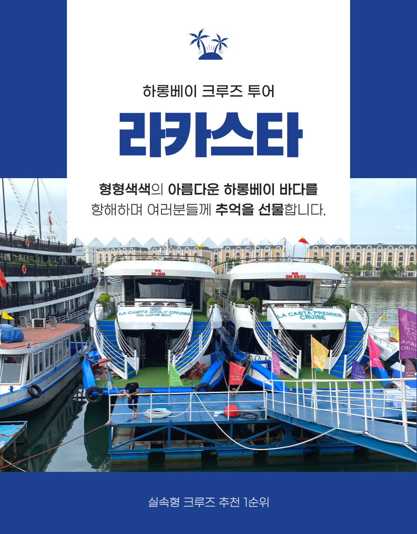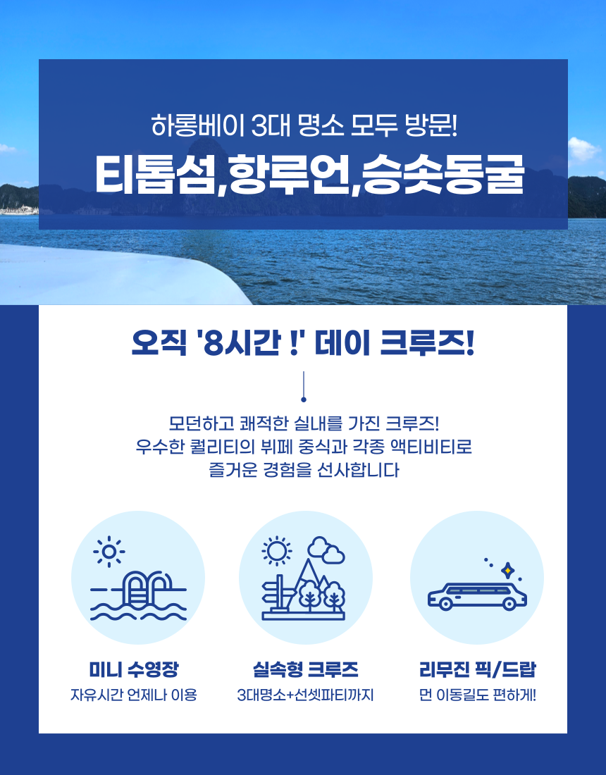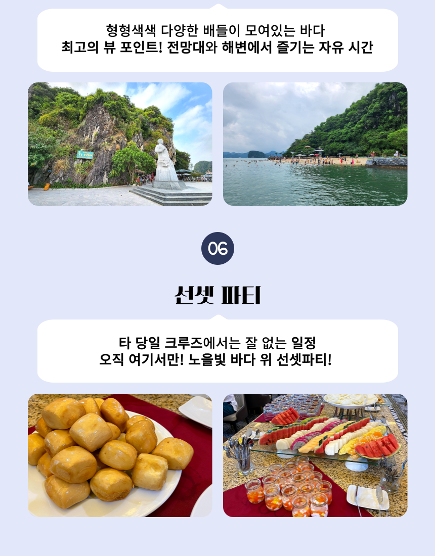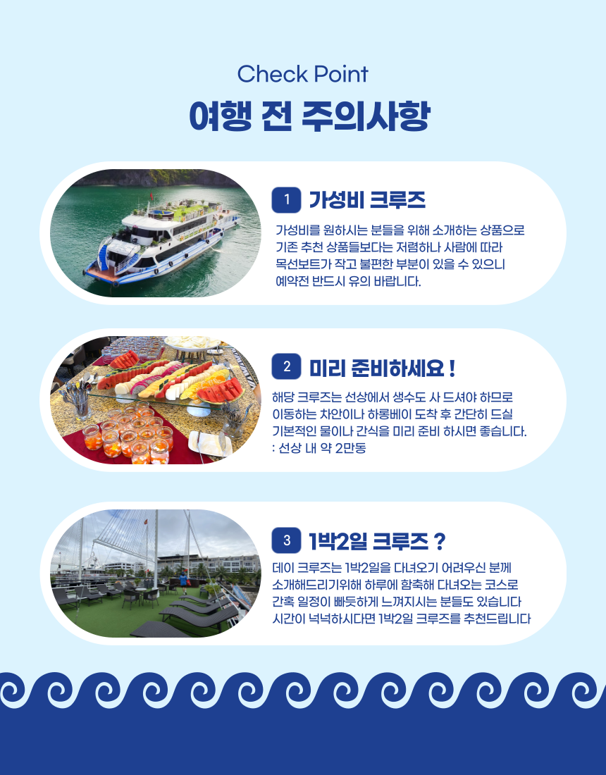 이렇게 상품에 대한 간단한 설명을 드렸구요. 저희 아이러브베트남에서는 정확한 정보 전달을 위해 당연히!!! 해당 크루즈를 직접 방문하고 있습니다. ! 주의 ! 저희처럼 상세한 설명이 없다면 직접 다녀오지 않고 판매하는 경우가 많으니 주의하세요 그럼 여행 일정을 세세히 살펴보도록 하겠습니다~ 레츠 고우!!!👉👉 * 지금부터 이하 내용들은, 당일 크루즈 현장 상황에 따라 예고 없이 변경될 수 있습니다.
