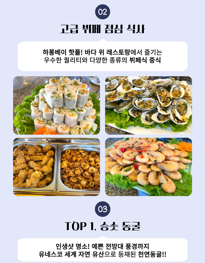 ☞ 하롱베이 3대 명소인 티톱섬, 승솟동굴, 항루언 방문 일정에 밤부보트/카약 중 택 1 체험이 가능한 투어형 크루즈입니다!!