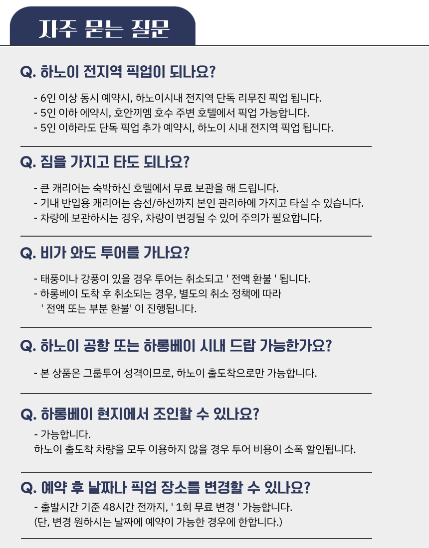 | 하노이 픽업을 포함하여 전체 취소시 | 전액 환불 / 날짜 변경 무료 |