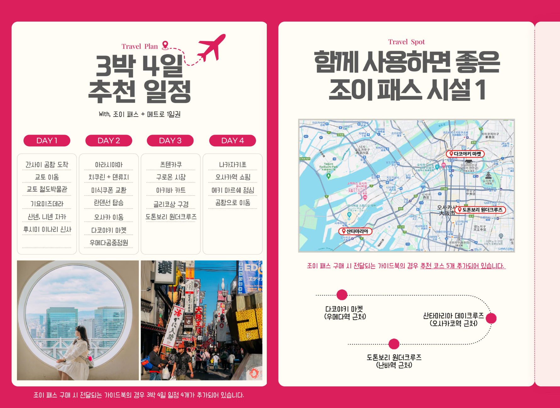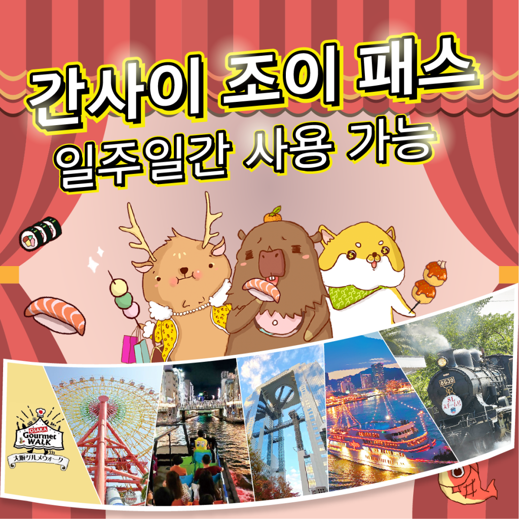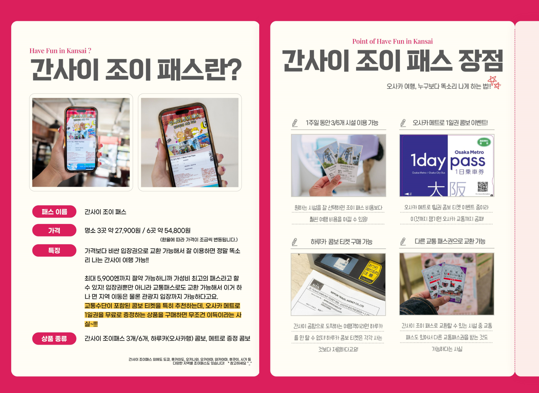 간사이 조이 패스로 여러 시설을 이용할 수 있지만, 교통패스가 없어서 아쉬웠던 분들에게 추천드립니다! 2024년 11월30일까지 기간한정으로 간사이 조이 패스를 구매하시면 오사카 메트로 1일권을 증정해 드립니다! 간사이 조이 패스 1개 가격으로 오사카 메트로 1일권까지 이용할 수 있어 매우 이득입니다😊 1. 간사이 조이패스 🎡 일주일 간 간사이 주요 시설 3곳 or 6 곳 선택! 일본의 오사카, 교토, 고베, 나라 등의 도시가 위치한 간사이 지역을 여행하는 분들에게 유용한 관광패스 🎫 한 개의 QR코드를 모바일에 저장해서 보관도 편리합니다. 다양한 시설들을 일주일 동안 3곳 또는 6곳의 시설을 저렴한 가격으로 이용할 수 있습니다! 야경부터 시작하여, 먹거리, 교통, 패러글라이딩까지 다양한 장르의 상품을 이용할 수 있습니다. 저렴한 가격으로 간사이 지역 명소를 입장할 수 있을 뿐만 아니라, 식당, 기념품, 교통까지 폭 넓은 혜택을 받아보세요 ※ 8월 7일부터 이용가능한 시설 추가 예정입니다. 1. 니시진 직물회관 손베틀 체험 & 선물 증정 (클리어 파일)(사전 예약 필요) 2. 야키니쿠 니쿠도시 후쿠시마점 1000엔 식사 티켓 이용가능한 시설과 영업시간은 홈페이지를 통해 확인 가능 합니다. 홈페이지 가이드북 링크 이용가능시설 구글맵표시 2. 오사카 메트로 1일권 🎫 오사카 지하철과 버스를 1일동안 무제한으로 이용할 수 있는 교통 패스 무제한 교통 뿐만 아니라 약 30여곳 주요 명소를 할인 받을 수 있는 기회까지! 대표 주요 명소: 우메다 공중정원, 오사카성 천수각, 덴포잔 대관람차, 덴도지 동물원 등 자세한 장소는 홈페이지를 통해 확인 가능 합니다. 바로가기 * 오사카 메트로 노선도