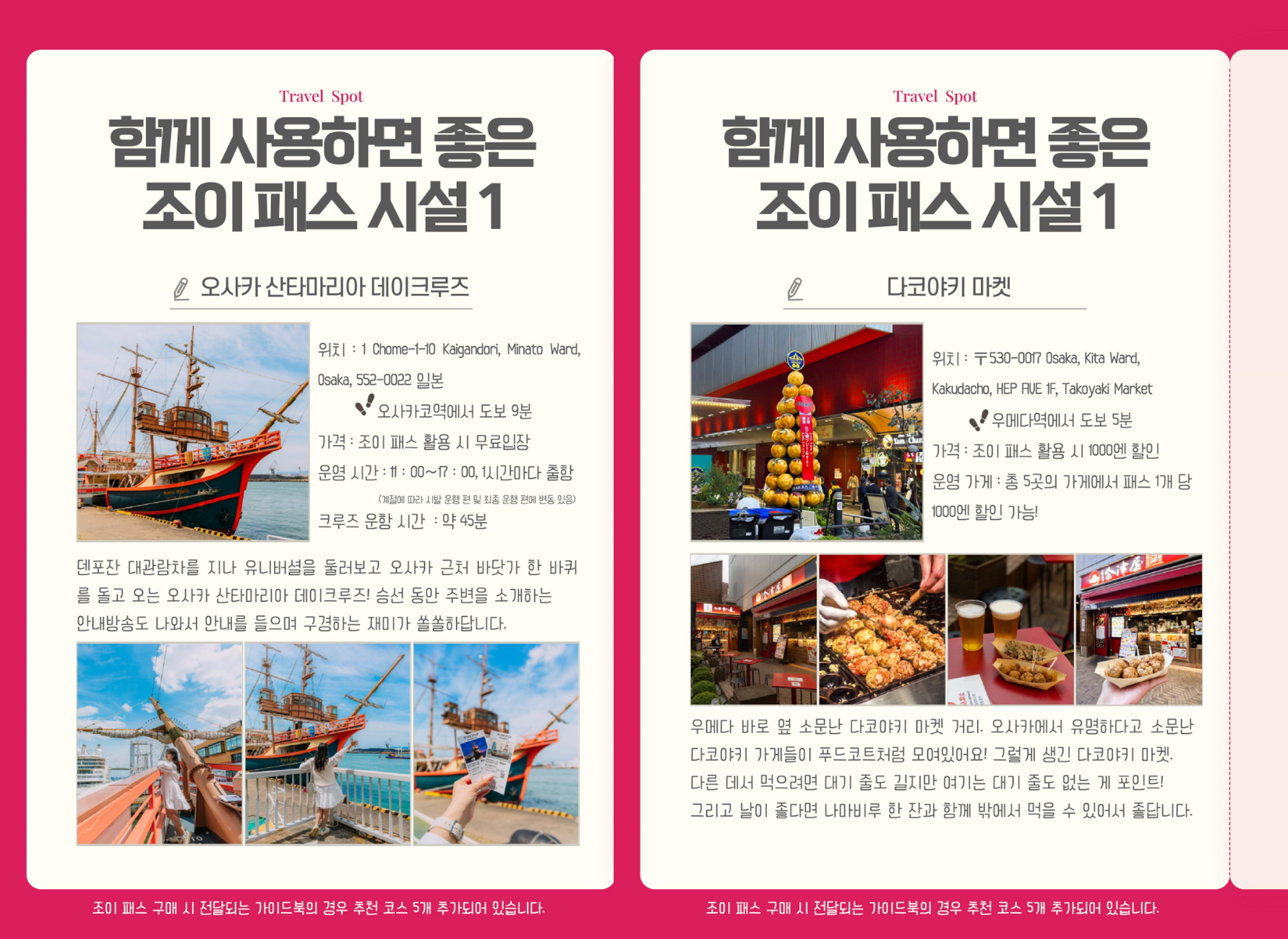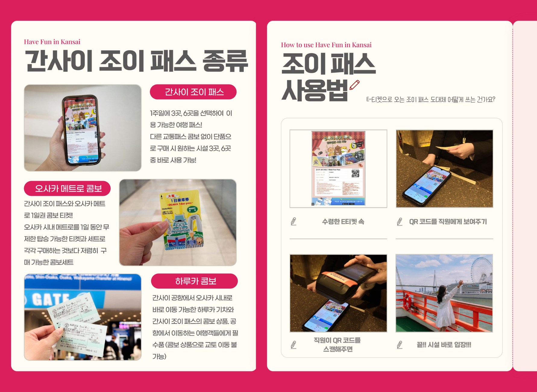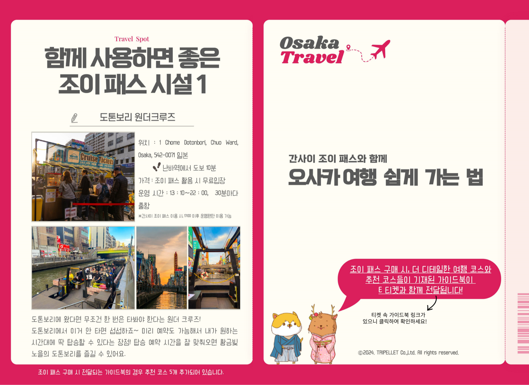간사이 조이 패스로 여러 시설을 이용할 수 있지만, 교통패스가 없어서 아쉬웠던 분들에게 추천드립니다! 2024년 11월30일까지 기간한정으로 간사이 조이 패스를 구매하시면 오사카 메트로 1일권을 증정해 드립니다! 간사이 조이 패스 1개 가격으로 오사카 메트로 1일권까지 이용할 수 있어 매우 이득입니다😊 1. 간사이 조이패스 🎡 일주일 간 간사이 주요 시설 3곳 or 6 곳 선택! 일본의 오사카, 교토, 고베, 나라 등의 도시가 위치한 간사이 지역을 여행하는 분들에게 유용한 관광패스 🎫 한 개의 QR코드를 모바일에 저장해서 보관도 편리합니다. 다양한 시설들을 일주일 동안 3곳 또는 6곳의 시설을 저렴한 가격으로 이용할 수 있습니다! 야경부터 시작하여, 먹거리, 교통, 패러글라이딩까지 다양한 장르의 상품을 이용할 수 있습니다. 저렴한 가격으로 간사이 지역 명소를 입장할 수 있을 뿐만 아니라, 식당, 기념품, 교통까지 폭 넓은 혜택을 받아보세요 ※ 8월 7일부터 이용가능한 시설 추가 예정입니다. 1. 니시진 직물회관 손베틀 체험 & 선물 증정 (클리어 파일)(사전 예약 필요) 2. 야키니쿠 니쿠도시 후쿠시마점 1000엔 식사 티켓 이용가능한 시설과 영업시간은 홈페이지를 통해 확인 가능 합니다. 홈페이지 가이드북 링크 이용가능시설 구글맵표시 2. 오사카 메트로 1일권 🎫 오사카 지하철과 버스를 1일동안 무제한으로 이용할 수 있는 교통 패스 무제한 교통 뿐만 아니라 약 30여곳 주요 명소를 할인 받을 수 있는 기회까지! 대표 주요 명소: 우메다 공중정원, 오사카성 천수각, 덴포잔 대관람차, 덴도지 동물원 등 자세한 장소는 홈페이지를 통해 확인 가능 합니다. 바로가기 * 오사카 메트로 노선도