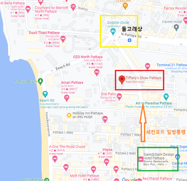 ▶ 티파니 쇼장 가는방법 티파니 쇼장은 일방통행인 세컨로드의 왼편에 있습니다. · 대중교통 이용시 : 세컨로드쪽에서 썽태우를 타고 가시다가 왼쪽에 Siam@Siam Pattaya 호텔을 지난 후 한국 식당이 몰려있는곳이 보이시면 벨을 누르고 하차하세요. 하차하신 곳에서 조금 더 걸어가면 왼편에 티파니 쇼장이 있습니다. · 택시 이용시 : 구글지도에 [Tiffany Show Pattaya] 를 검색해서 이동하시거나 기사님께 [빠이 티파니 쇼 카/크랍] 이라고 말씀해주세요.